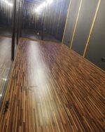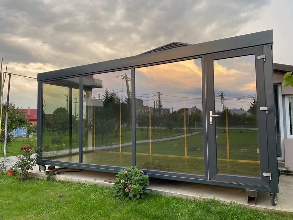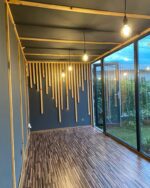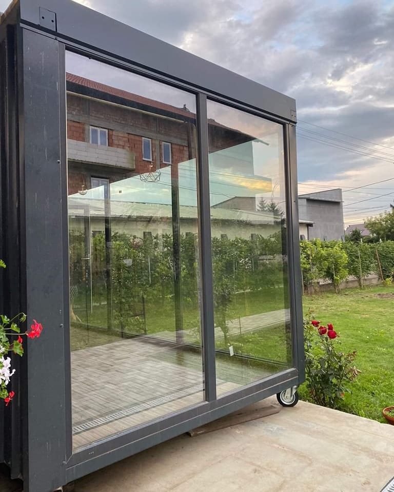 33 m² großer Showcase-Container, Abmessungen: 6,6 m x 5 m x 3,5 m (48 m²), Anzahl der Räume: 3, Wanddämmung: Steinwolle (10 cm), Boden- und Deckendämmung: Steinwolle (15 cm), Doppelverglasung, Vertikalfugendecke, Innenwände: feuchtigkeitsbeständige Paneele (geeignet für Getränke), Verpackung und Beleuchtung, Wasser- und Abwassersystem, Belüftungssystem: mechanische Belüftung in den Badezimmertüren, Innenbeleuchtung: LED-Beleuchtung in jedem Raum, Klimaanlage mit Heizfunktion
